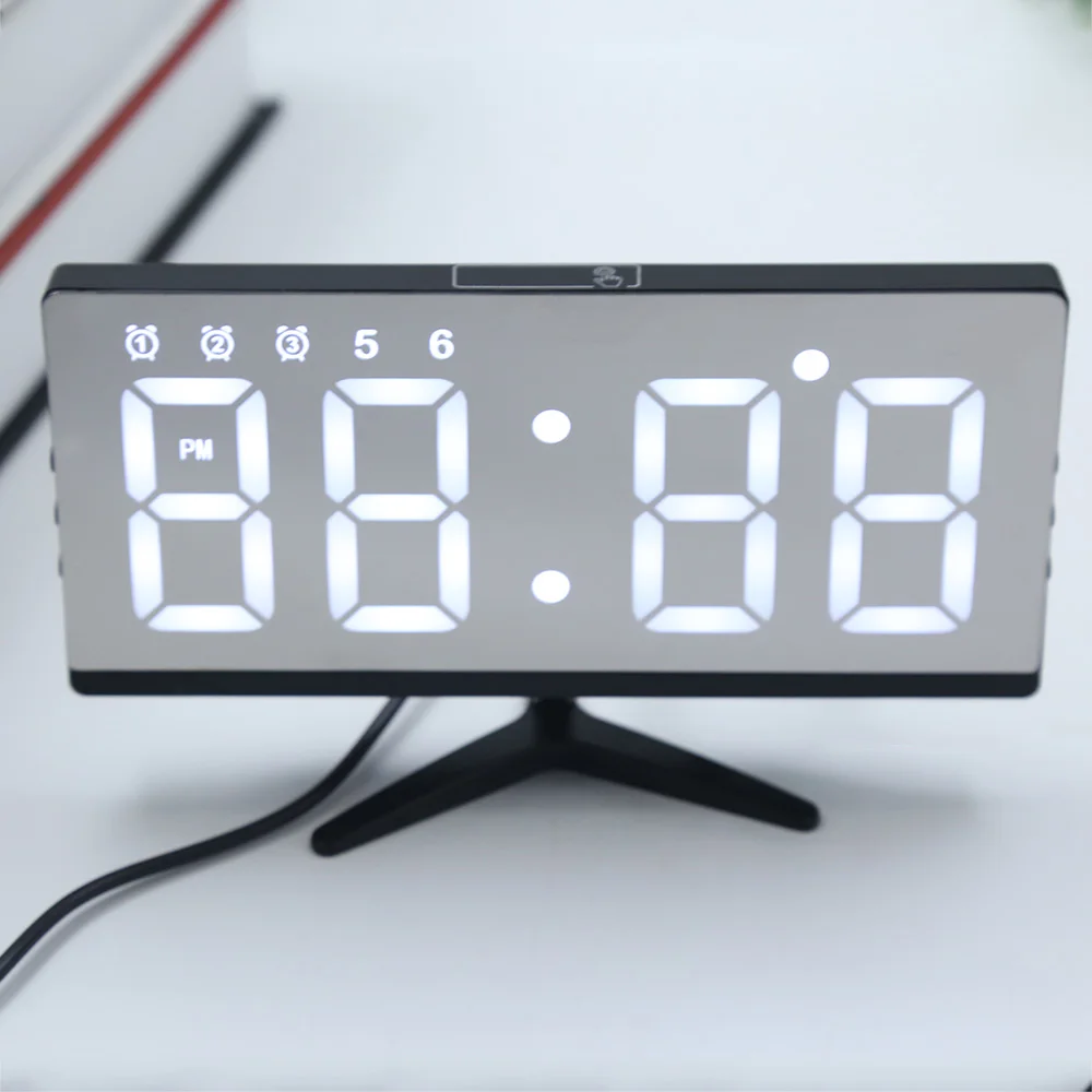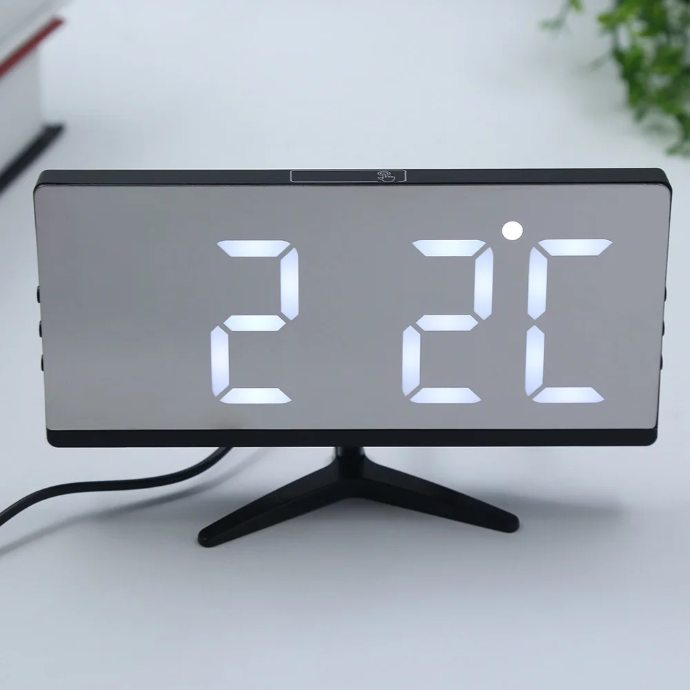 LED Mirror Digital Alarm Clock Snooze Time Date Temperature Cycle Display USB Charging Battery Powe