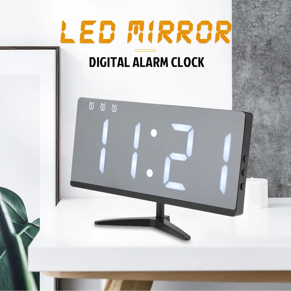 TOP LED Mirror Digital Alarm Clock Snooze Time Date Temperature Cycle Display USB Charging Battery Powe